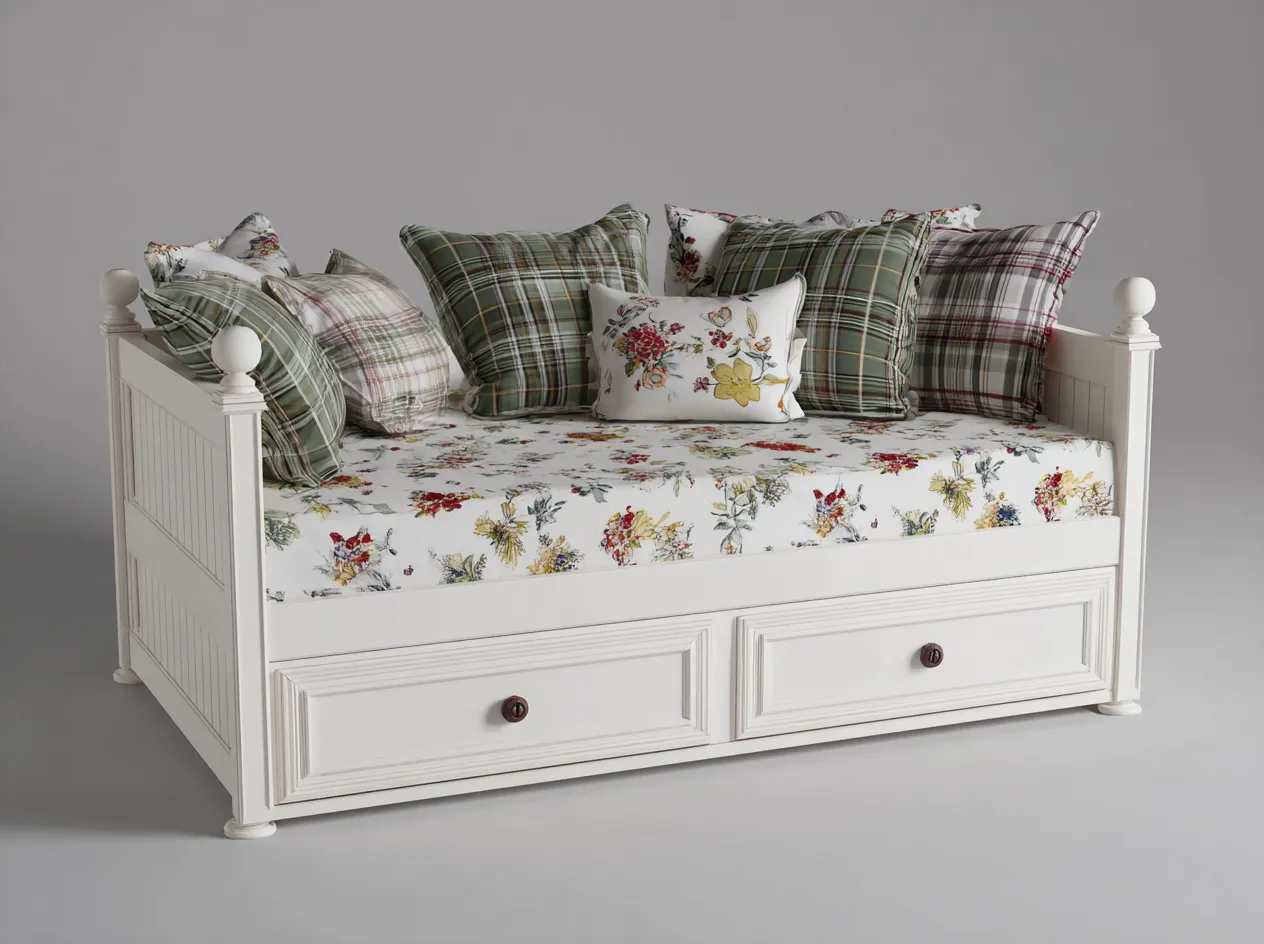 Schlafsofa - Holz-Stoff - 210 x 93 x 90 cm - Naturholz-Beige - Französischer Landhausstil mit Stauraumschubladen