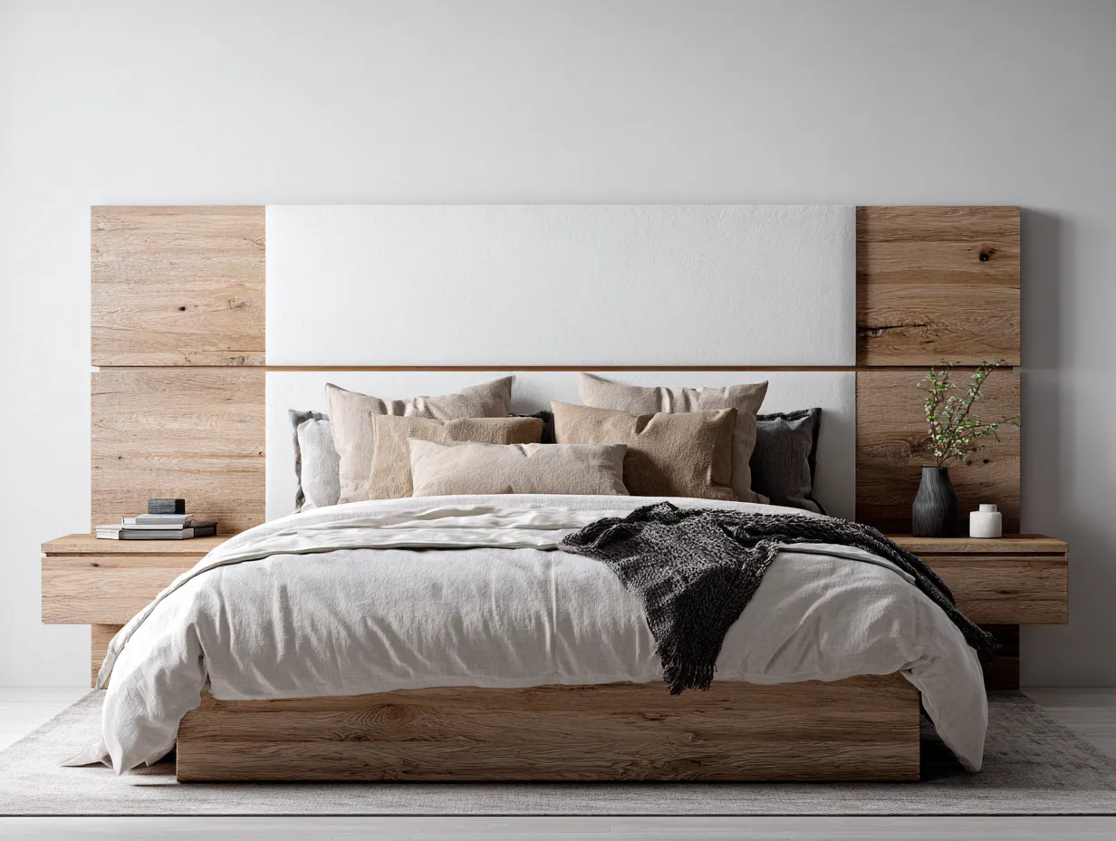 Doppelbett - Kunstleder-Holz-Metall - 216 x 198 x 118 cm - Weiß-Naturholz - Moderner Stil